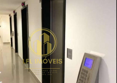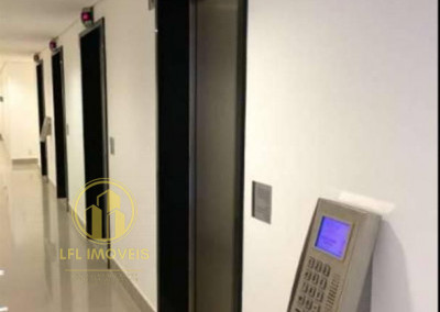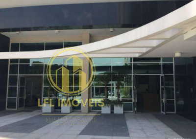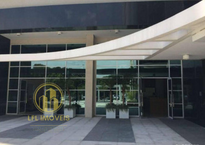 Conjunto comercial com 48 m², montado e pronto para uso, com piso elevado, carpete de madeira, tem em gesso com iluminação, ar condicionado, 1 sala fechada em vidro, copa, banheiro e varanda.